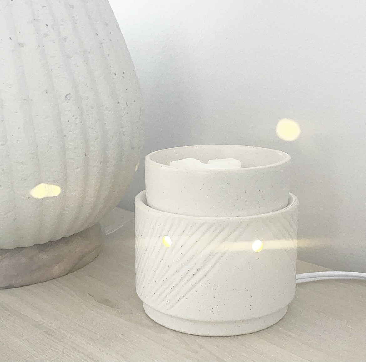 Truly a deluxe warmer! It's elegant and versatile design will complement your personal home decor and allows you to warm aroma melts in the dish or place your Sea Love candle tumbler directly on the warming plate. Enjoy the automatic shut-off timer with settings for 4, 8, or 12 hours! Subtle brown breaks over a white, bark-like texture with a flecked, creamy glaze.